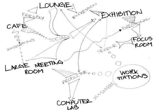 Challenge: Design a student center for a College of Design with a given plan to most efficiently fill your own program. This should be based on your own experience and research. It must include a cafe, storage, variety of seating, display, print lab, and computer room.